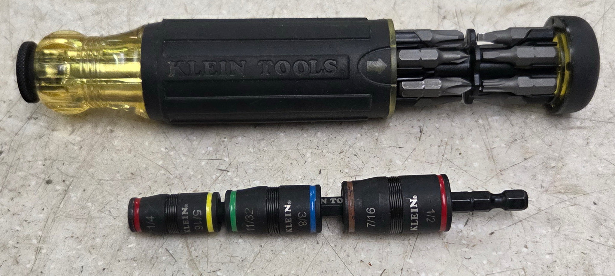Used Klein Tools 320303 14-in-1 Multi-Bit Adjustable Length Screwdriver / 32900R 7-in-1 Impact Flip Socket with Handle