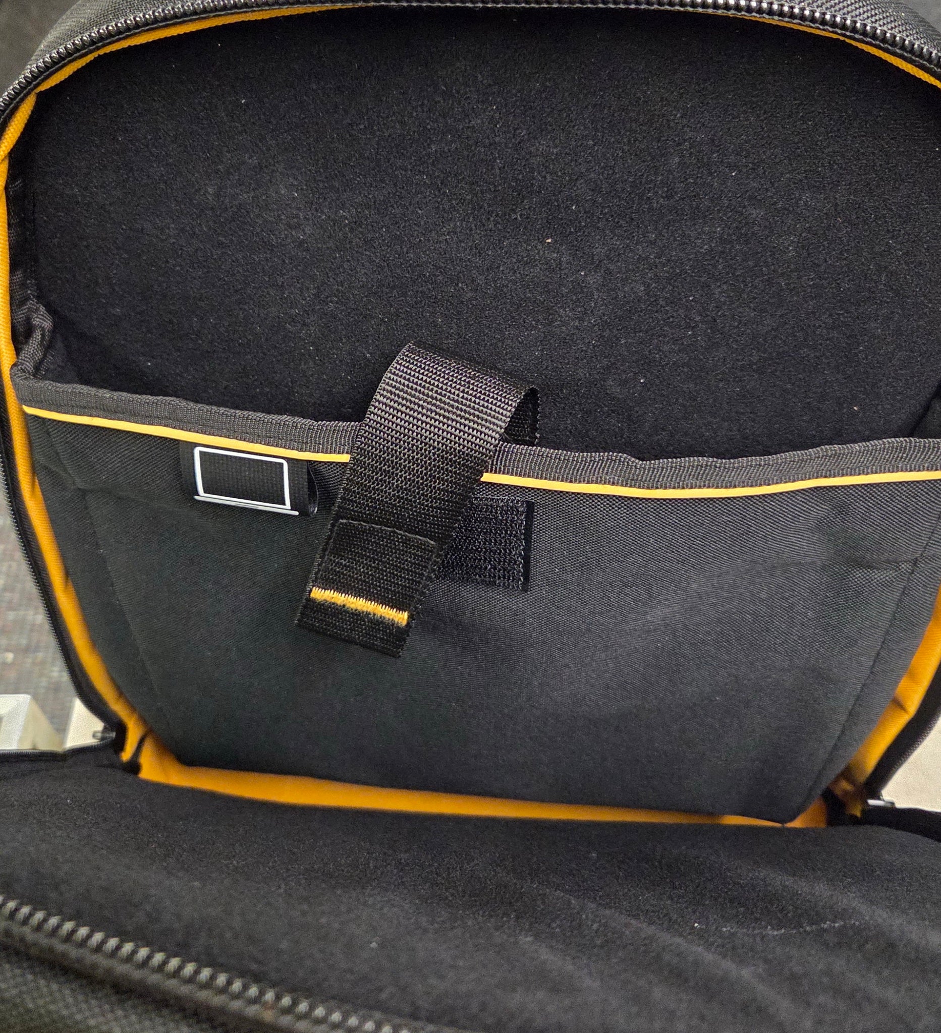 Used DeWALT DWST560102 Polyester 7.75-in W x 18.75-in D x 13.75-in L Zippered Backpack - Black/Yellow. The DeWALT emblem has been torn off the front).